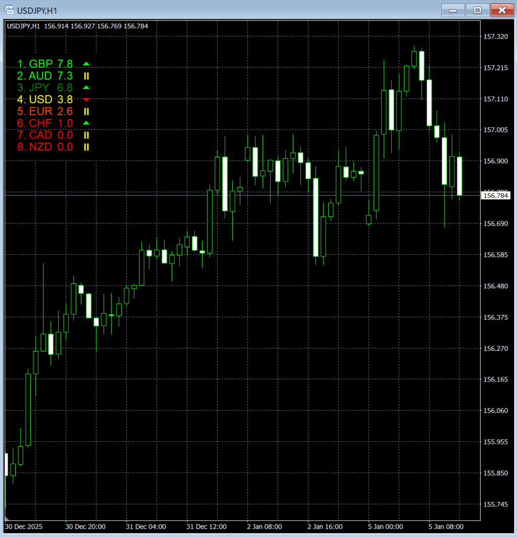 CM_Strengthは以下のようにチャート上にその時の通貨の強さがランキングで表示されるインディケータです。主要8カ国の通貨の状況しか表示されないのでマイナーな通貨には対応しておりません。