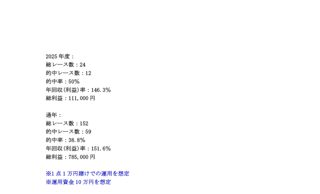 そんな私の手法でもお小遣い稼ぎくらいの収益は出せるので必要な方はこちらのサイトで予想方法の購入を検討してみて下さい。
