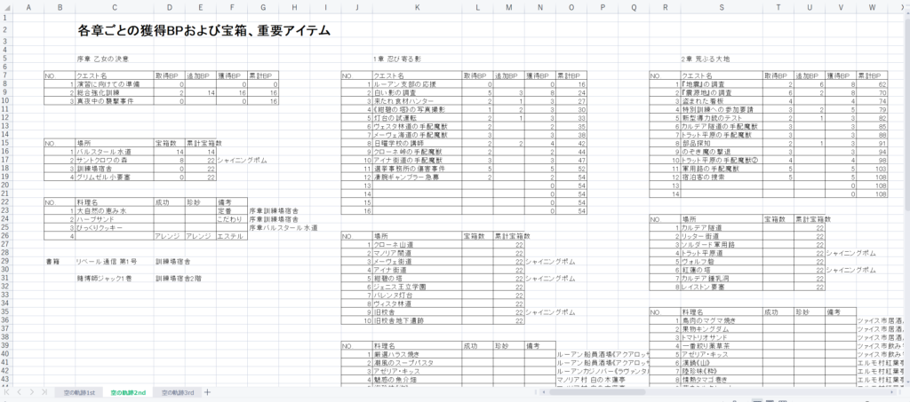 先にも述べましたが私はトロコン勢で1つのミスも許せない性分の完璧主義者なので1stプレイ時は体験版をプレイしながら次のような表を作成し、効率的にトロコン要素を回収しながらゲーム攻略を進められるように各章ごとに発生するクエスト、入手できる料理・書籍にLV上げでお世話になるシャイニングポムの出現場所を記載して、もし取り逃しが発生してもどのポイントでやらかしたかを検知できるようにしながら攻略をしていました。
