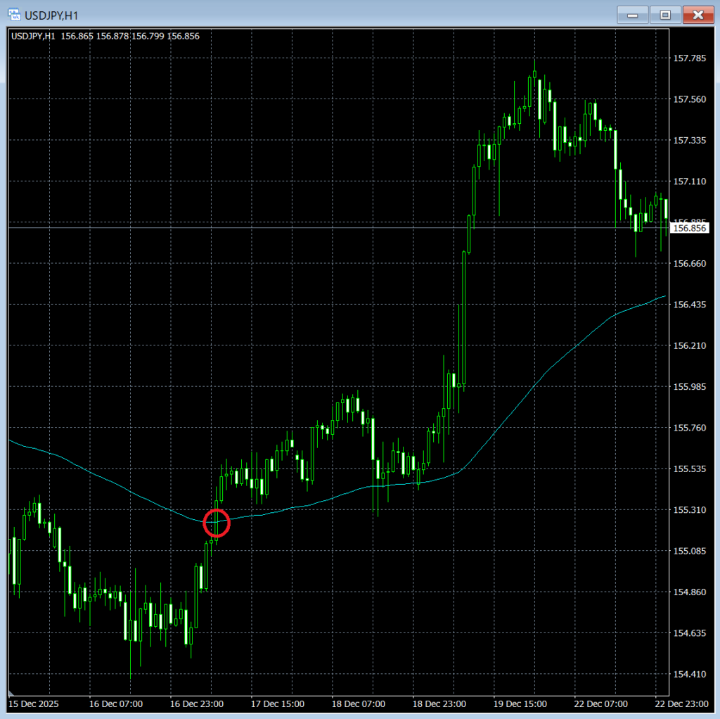 移動平均線をローソク足が陽線で突き抜けた箇所が5つありますがどの地点で入ったとしても含み損を抱えている状態となりますのでたった1つの理由だけで即エントリーしてしまうのはとても危険な行為です。
