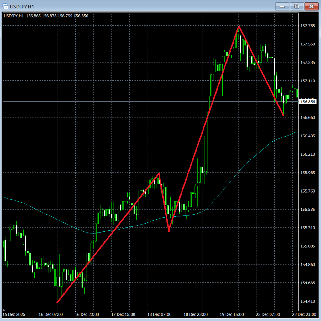 エリオット波動の推進者は3波が出現するのを今か今かと待っているので3波の起点となりそうな値位置では買いが入って長い下ヒゲが散見されているのが確認出来るかと思います。これは3波確定だ!と思った投資家達はこぞって買い注文を入れて来た結果、急激な上昇となったという見方になります。