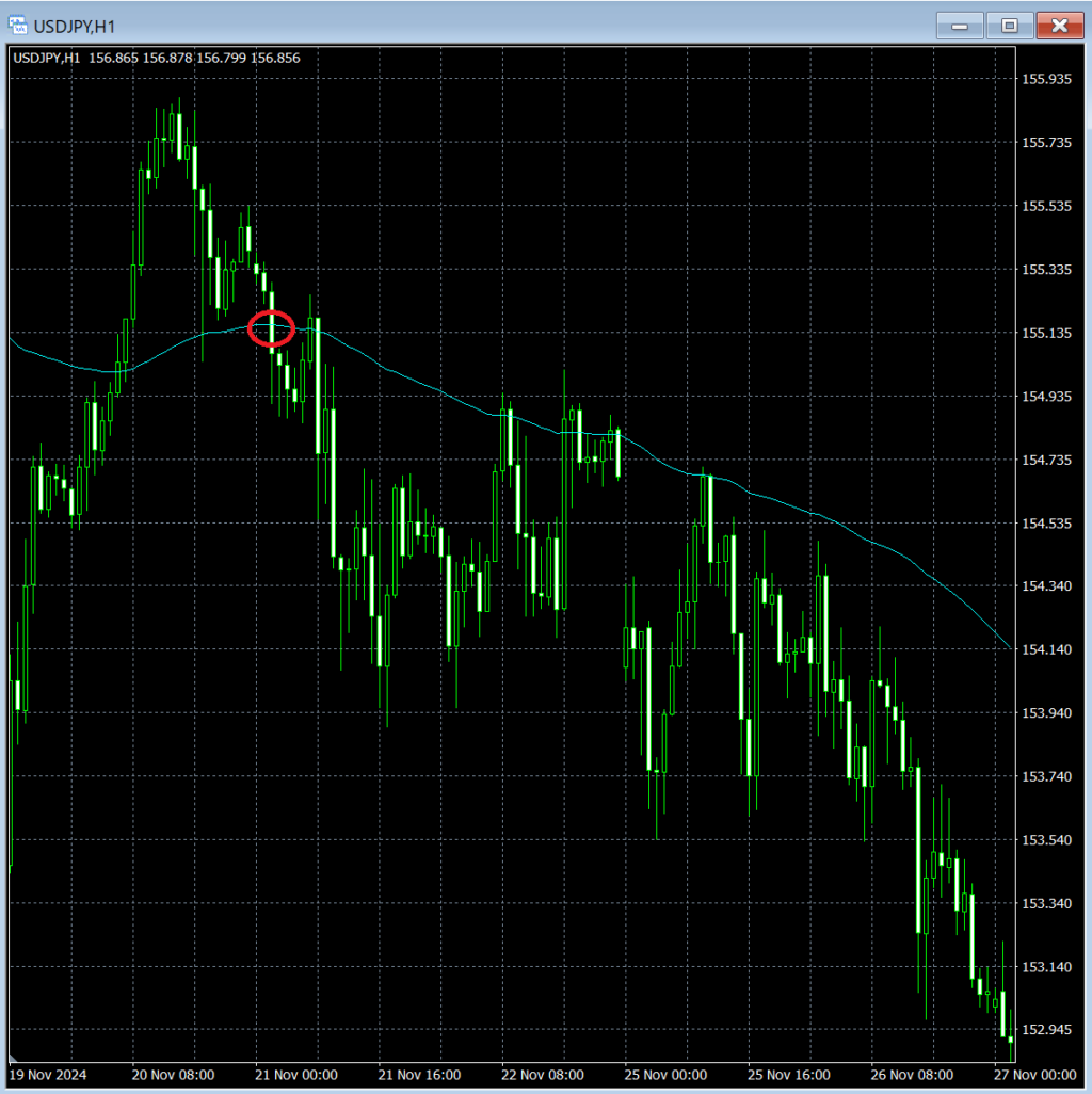 ここで大事な事は上昇トレンドの時と同じで移動平均線をローソク足が陰線で突き抜けた!下降トレンドだ!!今すぐ売りだ!!!ということじゃないんです。
