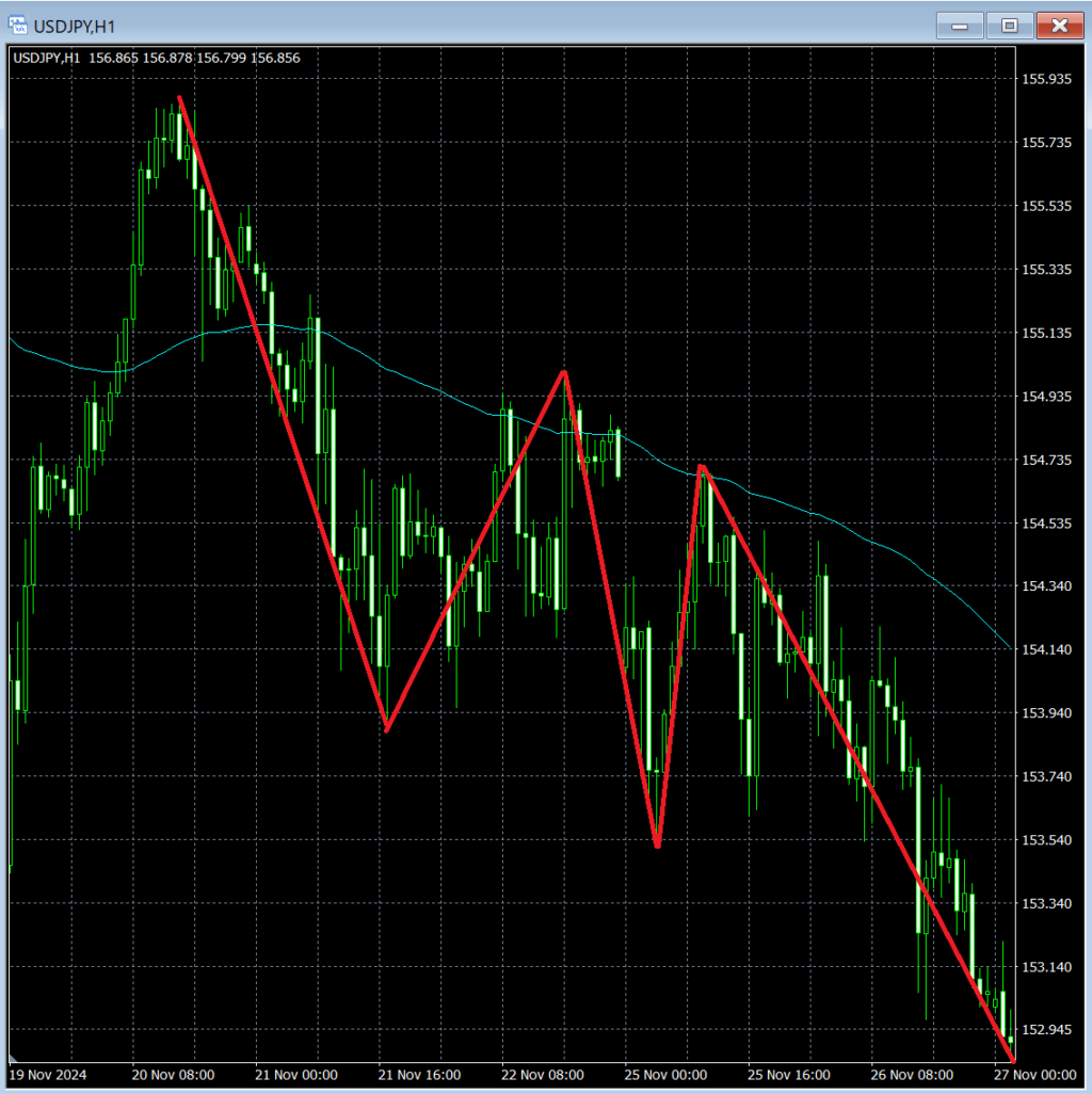 下降トレンドにおいても全く同じ考え方で以下のようになります。
