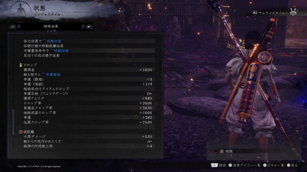特に今作ではDLCが第二弾までしか無いということで従来の仁王シリーズのようなDLC第一弾でキラOP解禁、第二弾で神宝解禁という手順が崩れており、DLC前からキラOPが解禁されていますのでもしかするとDLC第一弾で神宝解禁で武の深奥などのような効果発動には高いステータス値を必要とする特殊効果が実装され、ステータスも200まで振れるようになる可能性がありますのでDLC解禁後に有利に立ち回るためにも出来るだけアムリタ稼ぎもしておきたいところです。