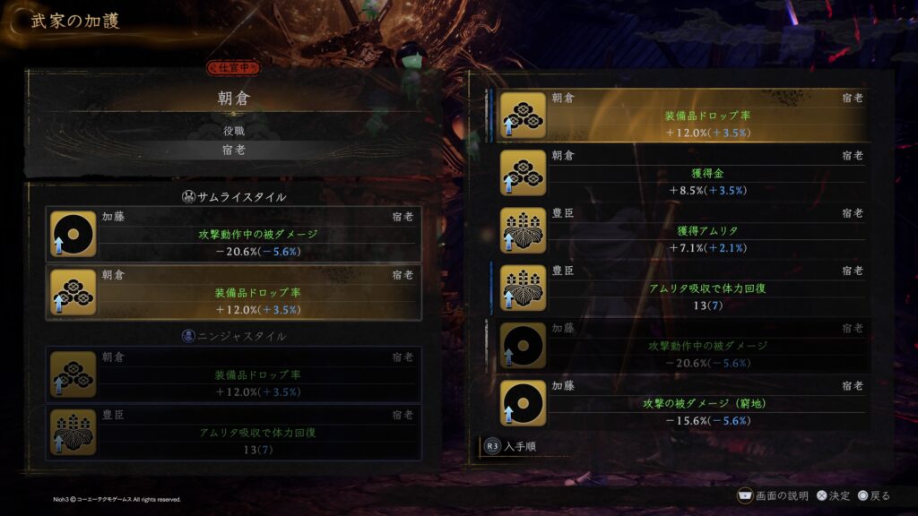 今作でも武家に所属することで様々な恩恵を得られるシステムは健在のようで、特に今作では1つの武家にずっと所属しなくても他武家の恩恵がそのまま得られるという手当たり次第に所属した方が得というシステムになっているので自分の立ち回り方やスタイルによって有利に働く受けたい効果を持っている武家を渡り歩いて恩恵を自由に付け替えが出来るようになりました。