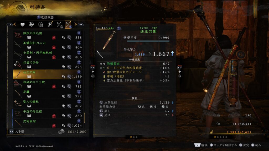 youtube上を見渡してみると仁王3のゲーム配信者がLV170の装備集めや八尺瓊勾玉周回などのライブ配信や稼ぎポイントの紹介動画を上げていたのでどうして自分だけLV170の武器がドロップしないのだろうとホントにバグを疑っていました。