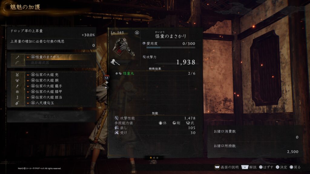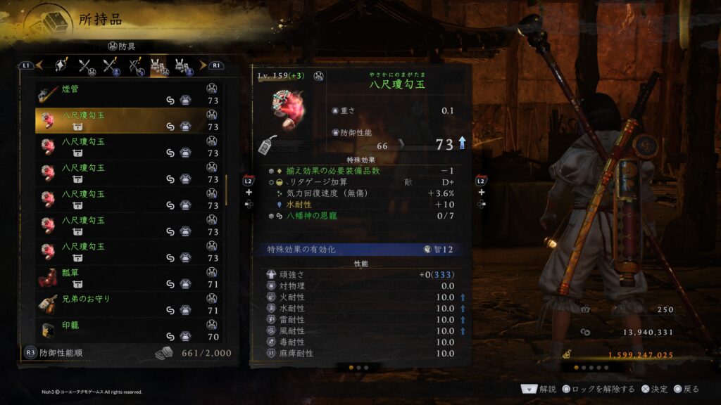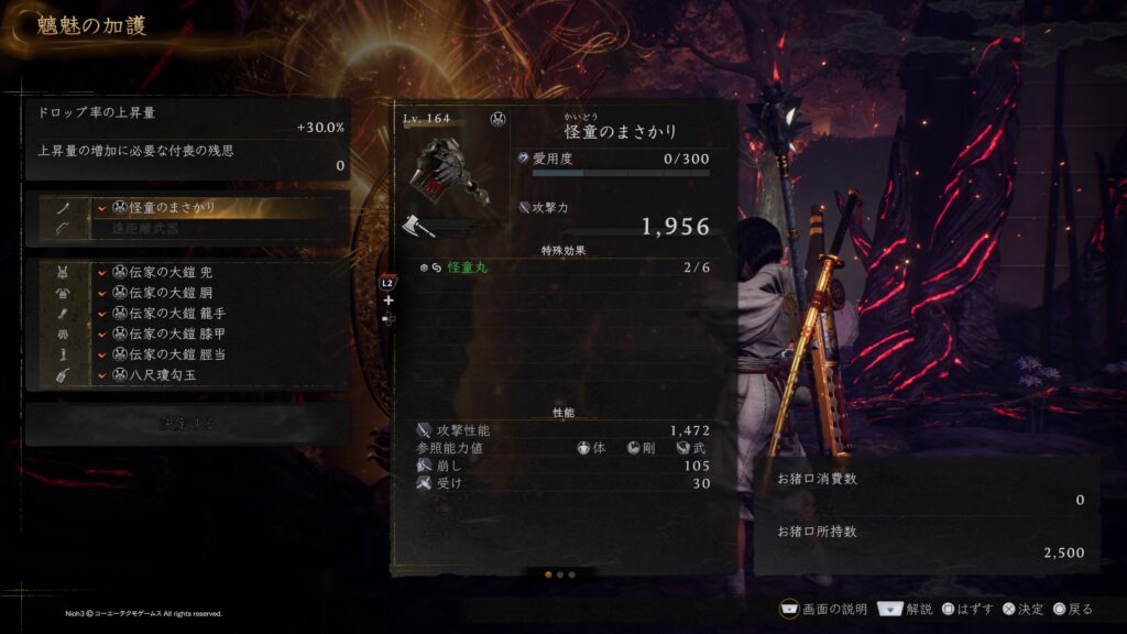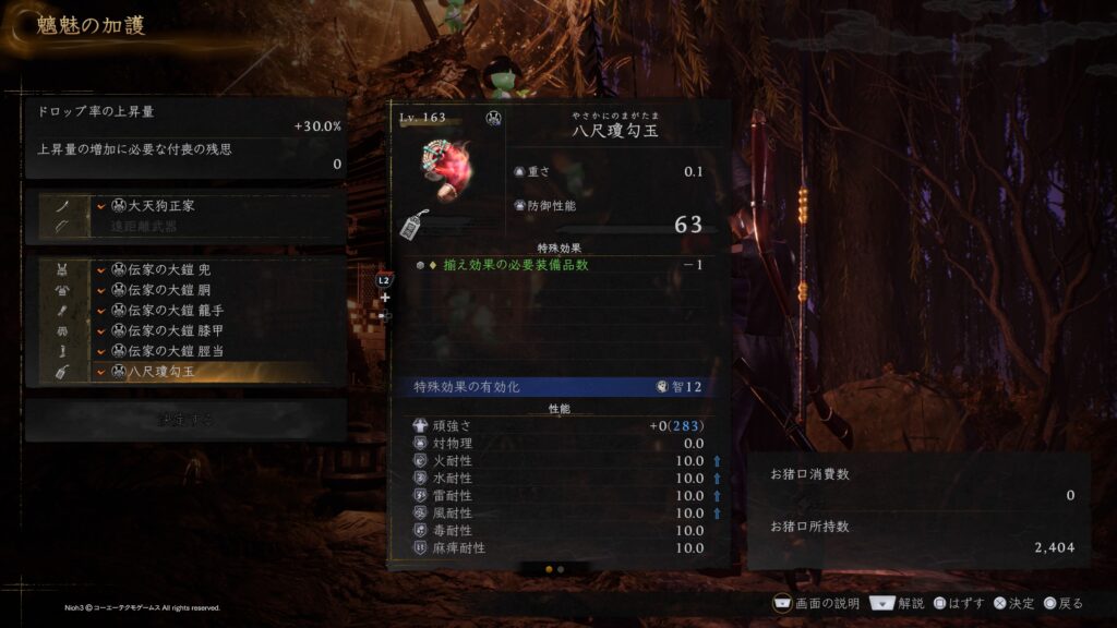 今作では屍狂いから小物もドロップするようになり、極低確率ですが屍狂いからの八尺瓊勾玉ドロップを確認しておりますので、確実に装備しているであろうラスダンで八尺瓊勾玉ドロップも視野に入れたドロップマラソン周回のついでに付近の血刀塚堀による武功稼ぎのついでに狙ってみるのもアリだと思います。