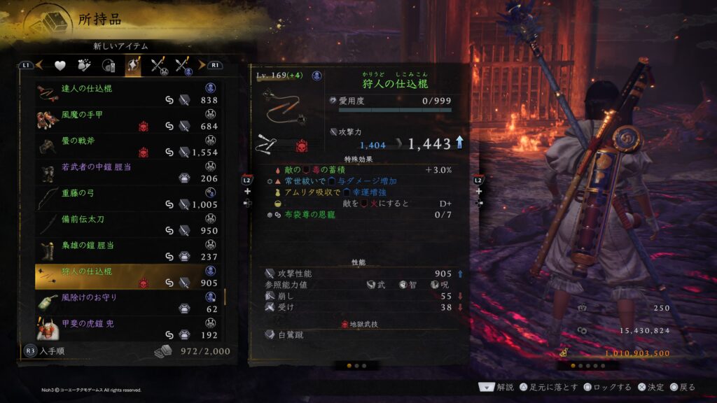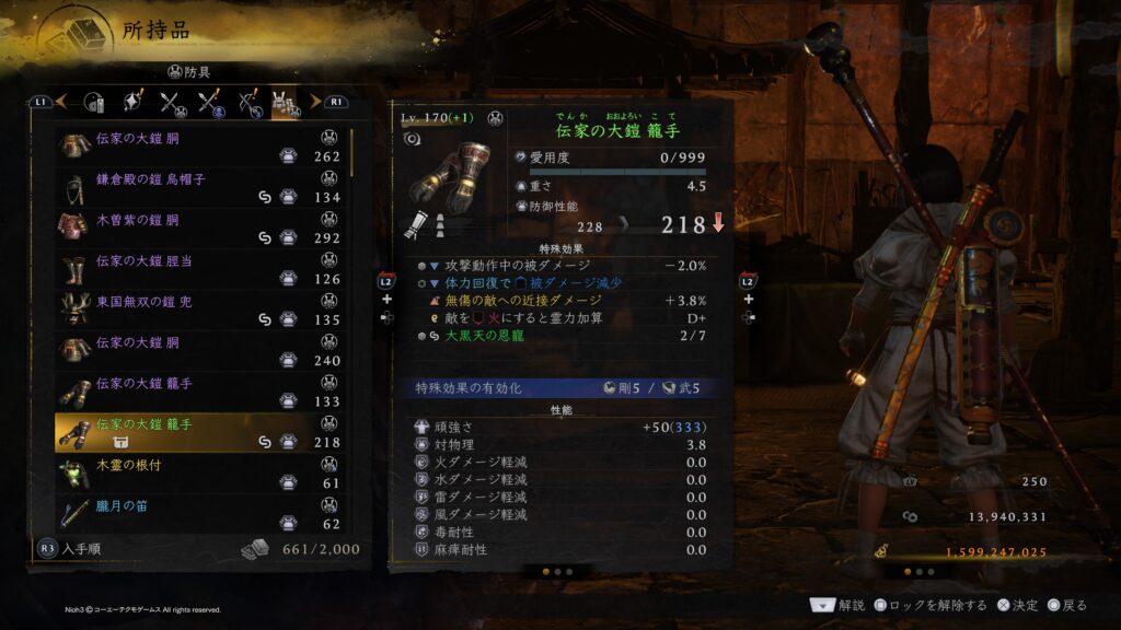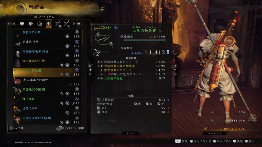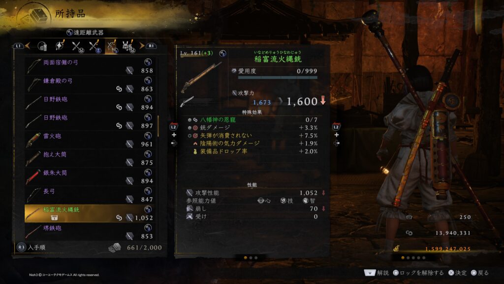 その理由は圧倒的にお金が無いという理由に尽きると思います。まさか仁王1の時に味わったお金不足が仁王3でも起こるとは想定しておりませんでした。サムライ&ニンジャの全装備をLV170(+15)にするには10億超のお金が必要になるかと思いますが、今作では金策する手段がほぼ無くて稼げても数万程度の小銭を延々と守銭奴のように溜めるという作業をしなければならないので仁王2の時にあった配信ミッションのように金策出来るミッションが配信されないと途中で投げ出すか+10程度で妥協してしまうのではないかと思います。