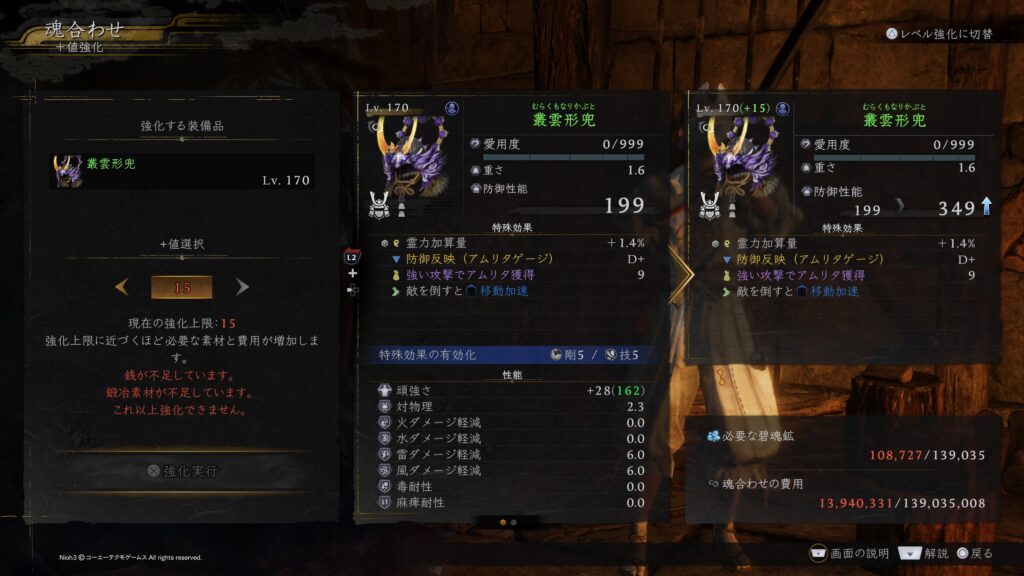 以下は2周目クリア時の報酬で貰ったLV170の頭防具ですが一気に+15にしようとすると約1億3,900万の銭が必要となります。